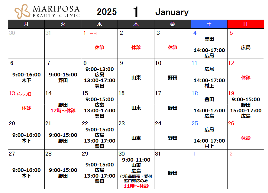 | 月 | 火 | 水 | 木 | 金 | 土 | 日 | 祝 |